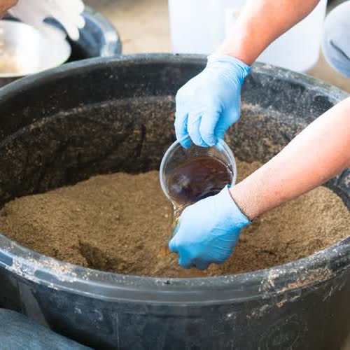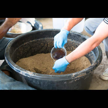 คำอธิบาย : ค่อยๆ ราดส่วนผสมแบบน้ำที่เตรียมไว้ไปที่ส่วนผสมแบบแห้ง ในการทำดังโงะ |