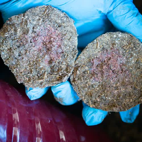 | คำอธิบาย : ก้อนดังโงะที่พร้อมใช้จะมีฝ้าขึ้น เป็นเส้นใย ซึ่งก็คือจุลินทรีย์ที่ต้องการอากาศ เขาจะอยู่รอบนอก ส่วนข้างในเวลาผ่าจะเห็นไส้แดง ซึ่งก็คือจุลินทรีย์สังเคราะห์แสง ไม่ต้องการอากาศ เขาจะอยู่ข้างในสุด |