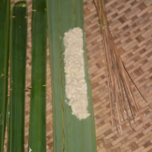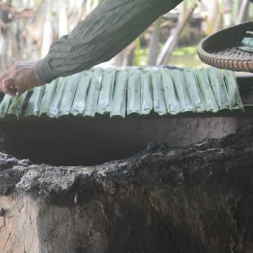 | คำอธิบาย : การนำใบจากมาห่อขนม |