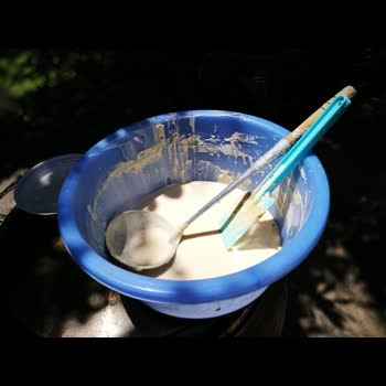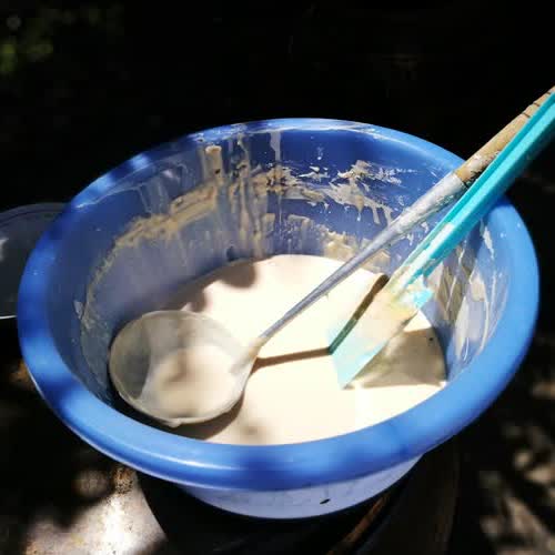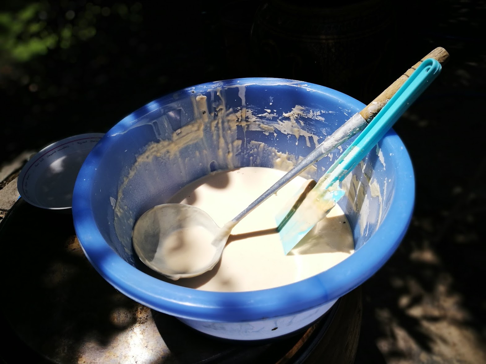| คำอธิบาย : ส่วนผสมของแป้งที่ไว้ชุบไส้ขนมกง มีไข่ไก่ น้ำกะทิ งาดำ แป้งข้าวเหนียวผสมทั้งหมดแล้วเอาตากแดด เพื่อให้ขึ้นฟู ก่อนที่จะนำมาใช้ชุบไส้ขนมกงแล้วทอด |