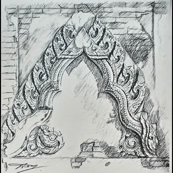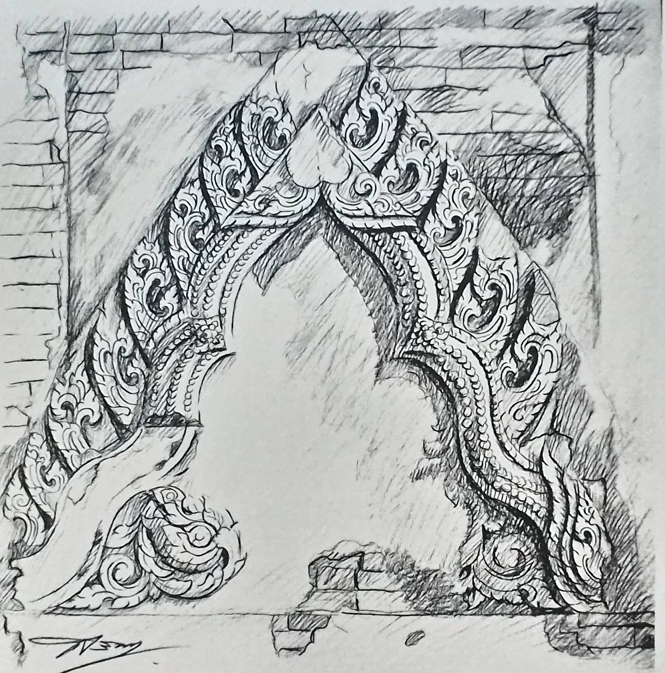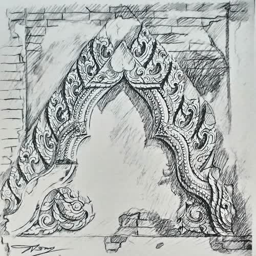 | คำอธิบาย : แม้ลวดลายปูนปั้นอันวิจิตรช่างประดิษฐ์กนกแนมแกมพฤกษาจำเนียรกาลผ่านไปให้โรยราอนิจจาไม่เที่ยงแท้ย่อมแปรปรวนอนิจจังเป็นหนึ่งในไตรลักษณ์ ที่คนมักจะบอกว่ารู้จัก และเข้าใจ แต่มักจะเห็นเฉพาะอนิจจังทางวัตถุว่ามีการเสื่อมมีการเปลี่ยนแปลง แต่อนิจจังที่มักจะไม่ค่อยเห็นคืออนิจจังในอารมณ์ ว่าแม้ในสุขและในทุกข์และแม้แต่อารมณ์ไม่สุขไม่ทุกข์ก็เต็มไปด้วยอนิจจังภาพลายเส้นนี้วาดเพื่อแสดงนิทรรศการวาดเส้นอุษาคเนย์ |