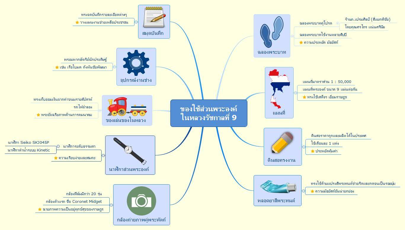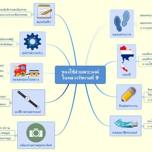 | คำสำคัญ : ของใช้ส่วนพระองค์, พระบาทสมเด็จพระปรมินทรมหาภูมิพลอดุลยเดช, แผนผังความคิด, Mind Map, XMind, รัชกาลที่ 9, ในหลวง |
