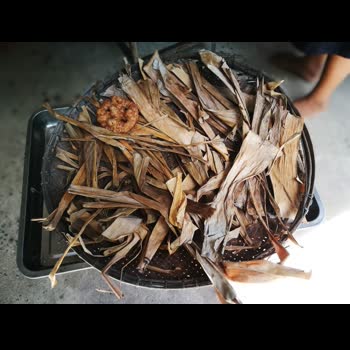 | ชื่อเรื่อง : นำขนมกงที่ทอดแล้วมาวางบนใบตองแห้ง |