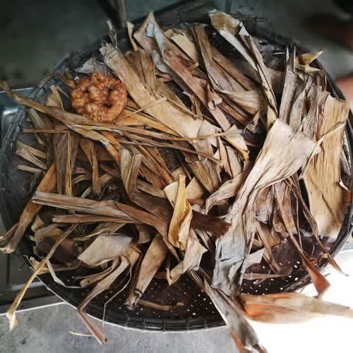 รีวิว : นำขนมกงที่ทอดแล้วมาวางบนใบตองแห้ง