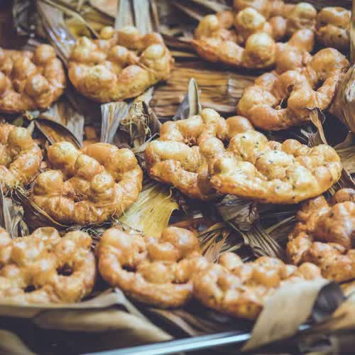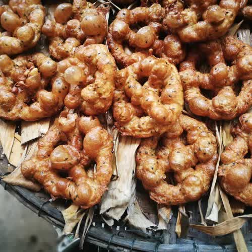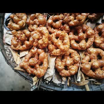 | คำอธิบาย : ขนมกงหลากหลายชิ้น ที่ซับน้ำมันแล้ว |