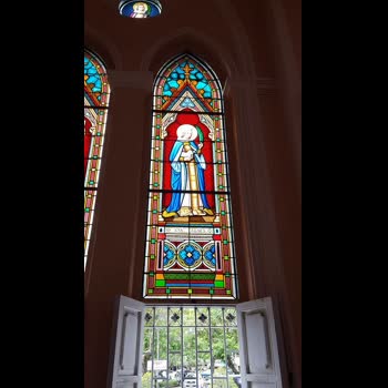 | คำอธิบาย : กระจกสี สเตนกลาส ศิลปะหน้าต่างโบสถ์คาทอลิกจันทบุรี หรือ อาสนวิหารพระนางมารีอาปฏิสนธินิรมล ซึ่งเป็นโบสถ์คริสต์คาทอลิกเก่าแก่ที่มีความสวยงามมาก เป็นสถาปัตยกรรมตะวันตกแบบโกธิค ถือว่าเป็น Unseen แห่งหนึ่งของเมืองจันทบุรี ตั้งอยู่ในตัวเมืองจันทบุรี บริเวณชุมชนริมน้ำจันทบูร |