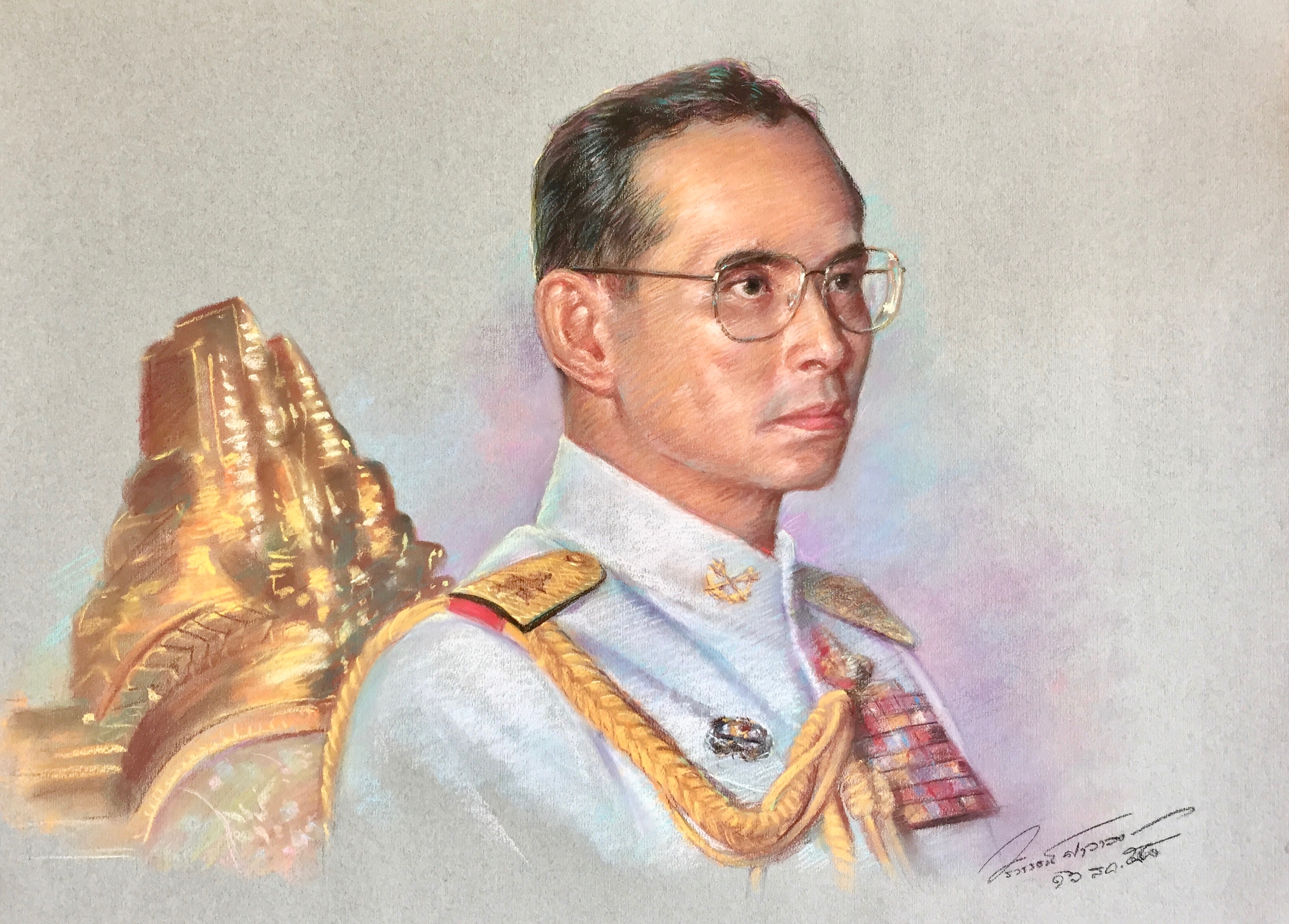 | คำอธิบาย : พระบรมฉายาสาทิสลักษณ์ พระบาทสมเด็จพระปรมินทรมหาภูมิพลอดุลยเดช ด้วยเทคนิคภาพวาดสีชอล์ก |