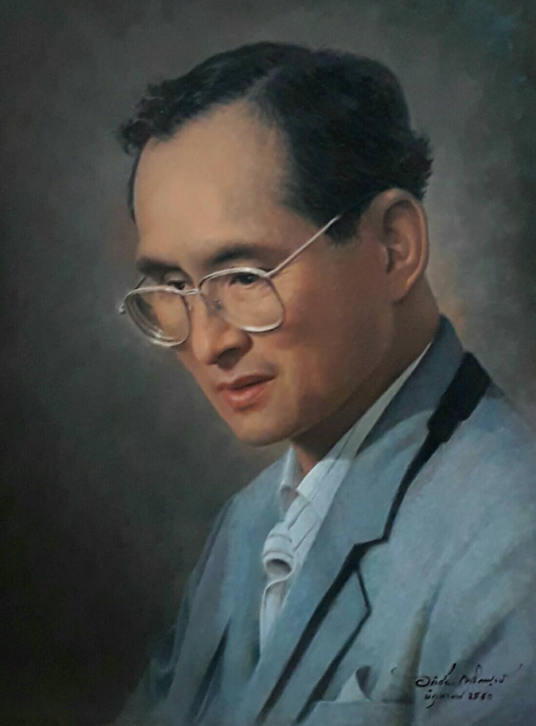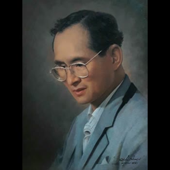 | คำอธิบาย : พระบรมฉายาสาทิสลักษณ์ พระบาทสมเด็จพระปรมินทรมหาภูมิพลอดุลยเดช ด้วยเทคนิคภาพวาดสีน้ำมัน |