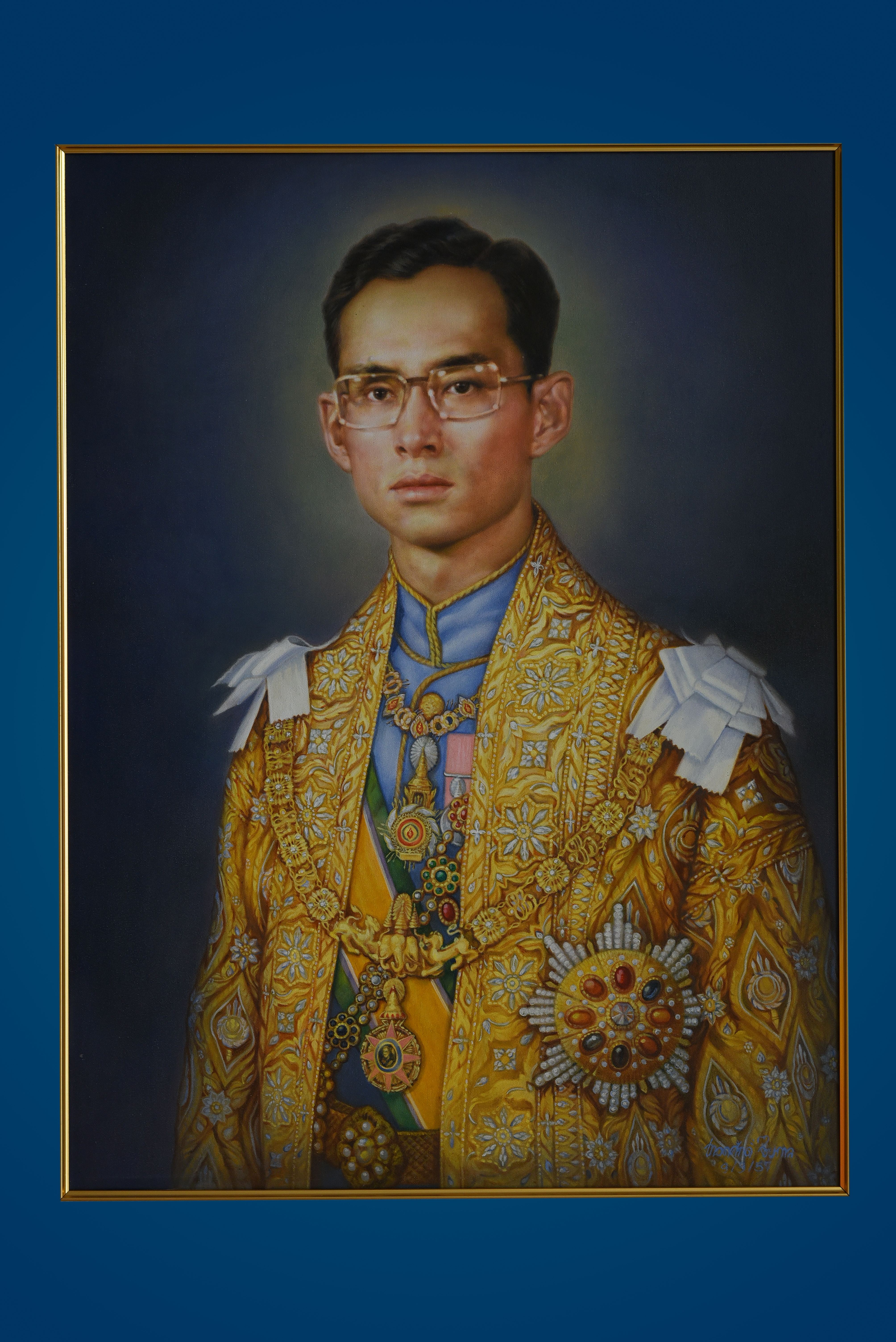 | คำอธิบาย : พระบรมฉายาสาทิสลักษณ์ พระบาทสมเด็จพระปรมินทรมหาภูมิพลอดุลยเดช ด้วยเทคนิคภาพวาดสีน้ำมัน |
