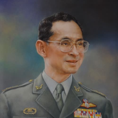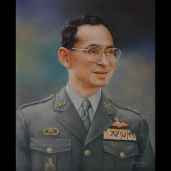| คำอธิบาย : พระบรมฉายาสาทิสลักษณ์ พระบาทสมเด็จพระปรมินทรมหาภูมิพลอดุลยเดช ด้วยเทคนิคภาพวาดสีน้ำมัน |