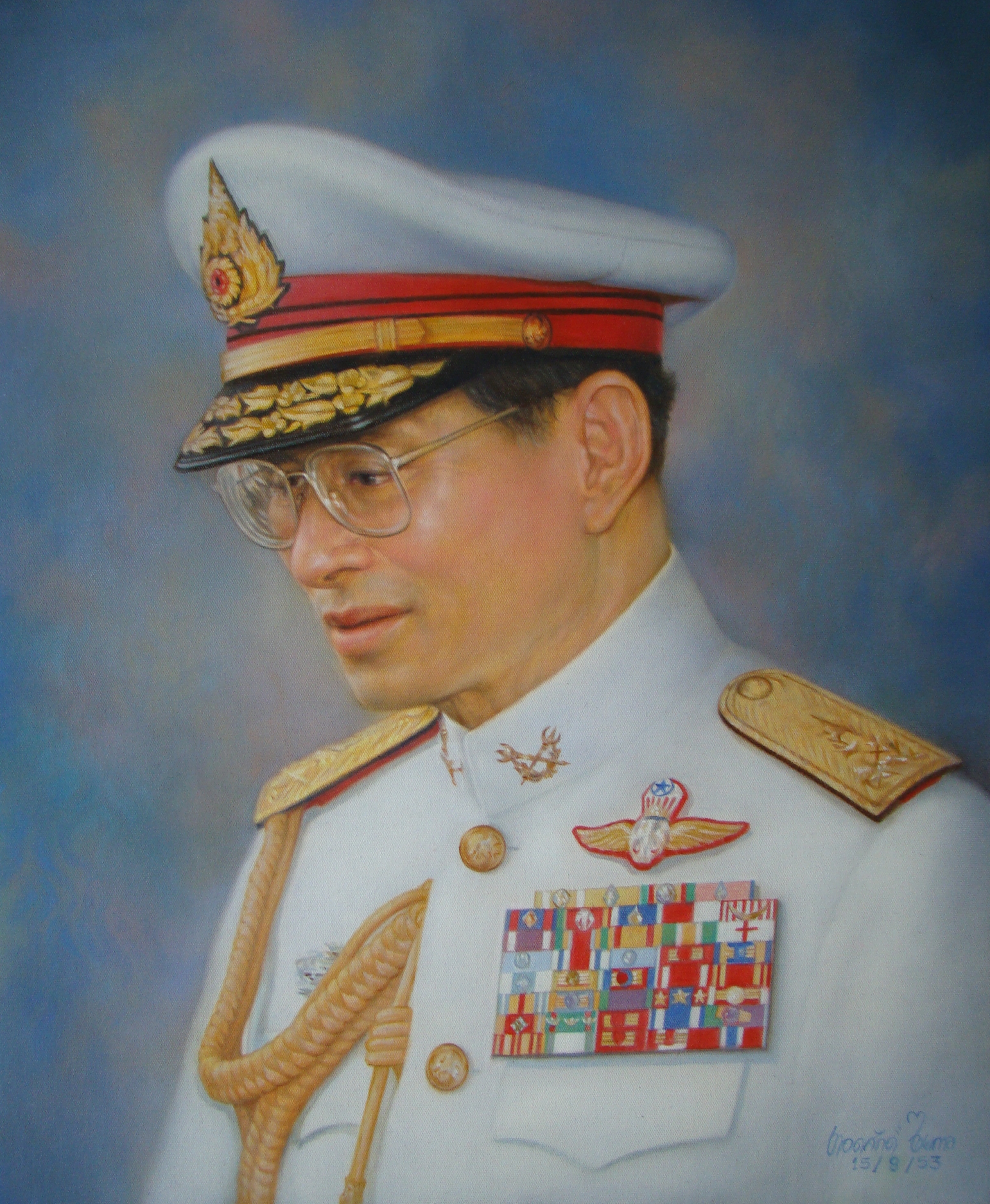 | คำอธิบาย : พระบรมฉายาสาทิสลักษณ์ พระบาทสมเด็จพระปรมินทรมหาภูมิพลอดุลยเดช ด้วยเทคนิคภาพวาดสีน้ำมัน |