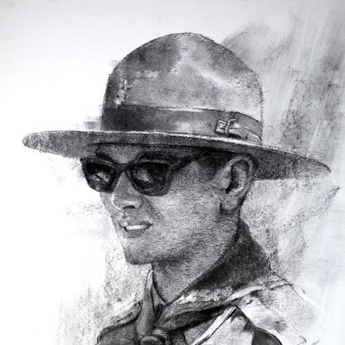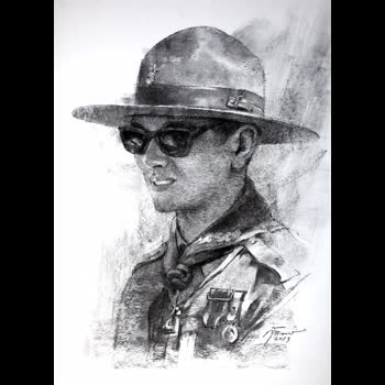 | คำอธิบาย : พระบรมฉายาสาทิสลักษณ์ พระบาทสมเด็จพระปรมินทรมหาภูมิพลอดุลยเดช ด้วยเทคนิค ชาร์โคลบนกระดาษ |