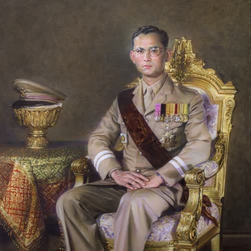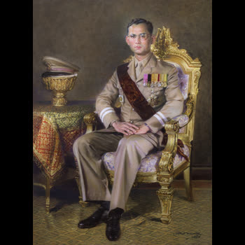 | คำอธิบาย : พระบรมฉายาสาทิสลักษณ์ พระบาทสมเด็จพระปรมินทรมหาภูมิพลอดุลยเดช ด้วยเทคนิค ภาพสีน้ำมันบนผ้าใบ |