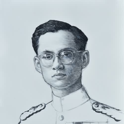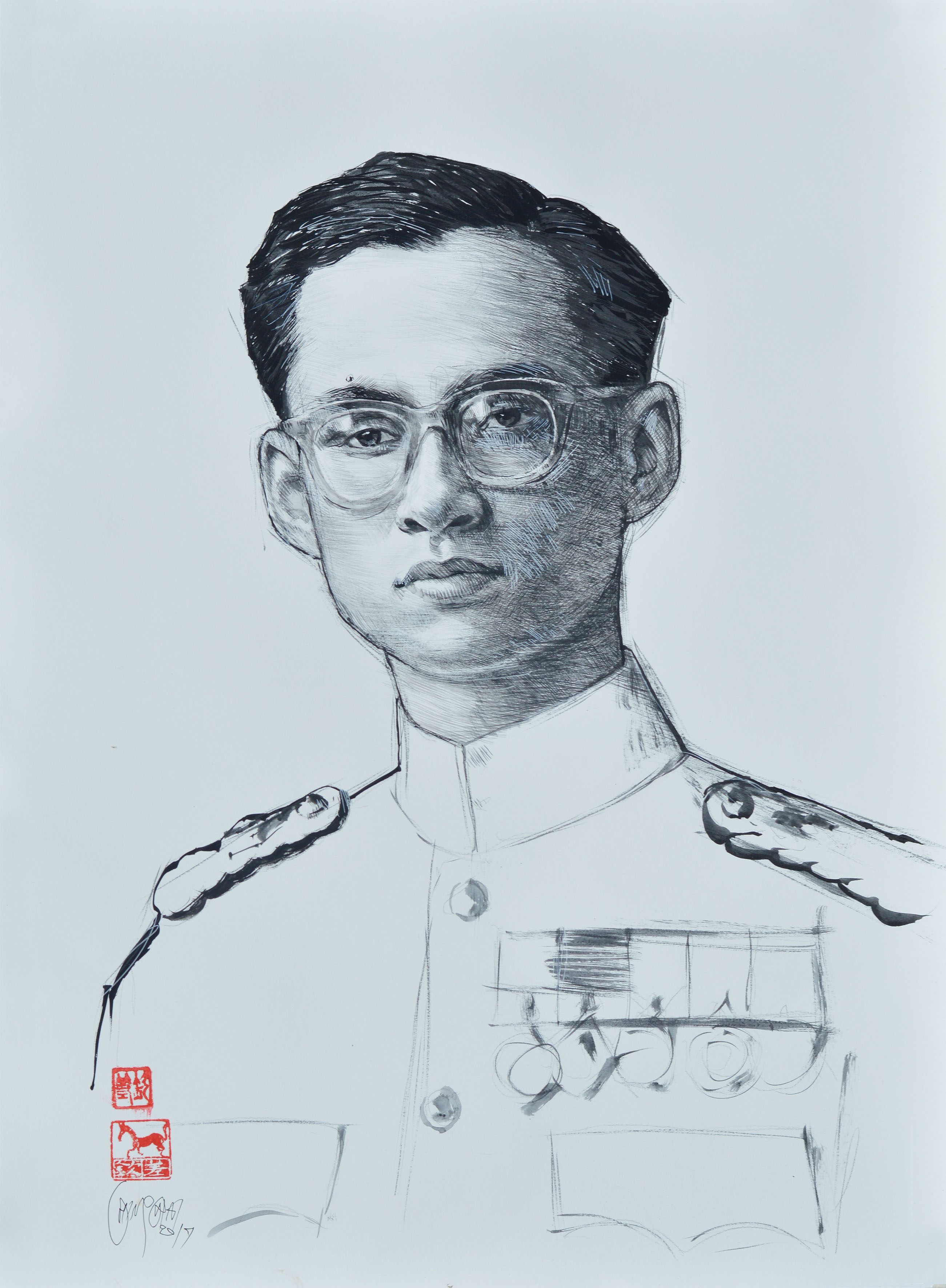 | คำอธิบาย : พระบรมฉายาสาทิสลักษณ์ พระบาทสมเด็จพระปรมินทรมหาภูมิพลอดุลยเดช ด้วยเทคนิคหมึกจีนบนกระดาษ |