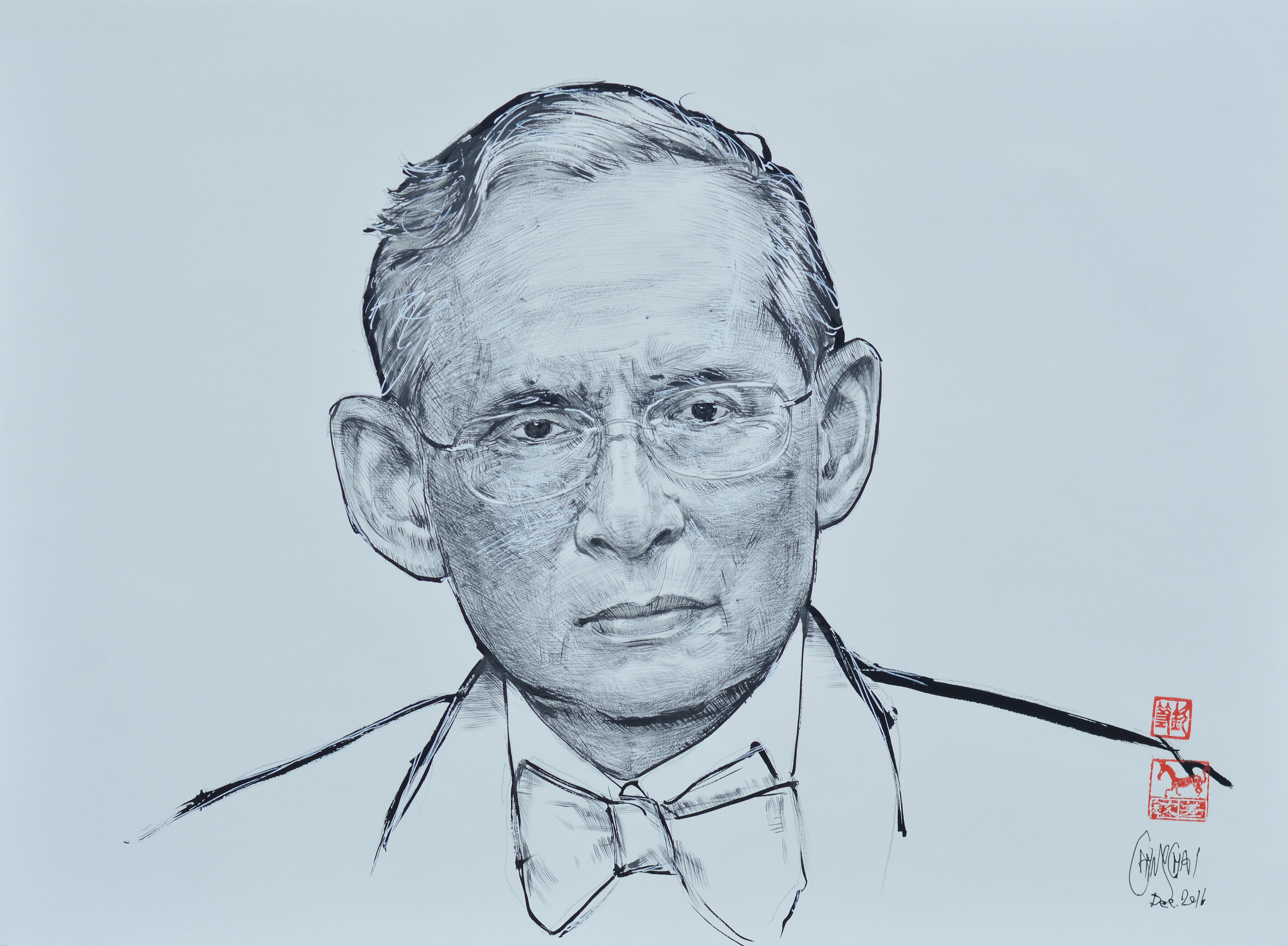 | คำอธิบาย : พระบรมฉายาสาทิสลักษณ์ พระบาทสมเด็จพระปรมินทรมหาภูมิพลอดุลยเดช ด้วยเทคนิคหมึกจีนบนกระดาษ |
