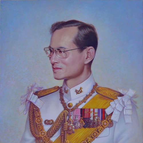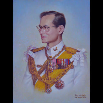 | คำอธิบาย : พระบรมฉายาสาทิสลักษณ์ พระบาทสมเด็จพระปรมินทรมหาภูมิพลอดุลยเดช ด้วยเทคนิคสีน้ำมันบนลินิน |