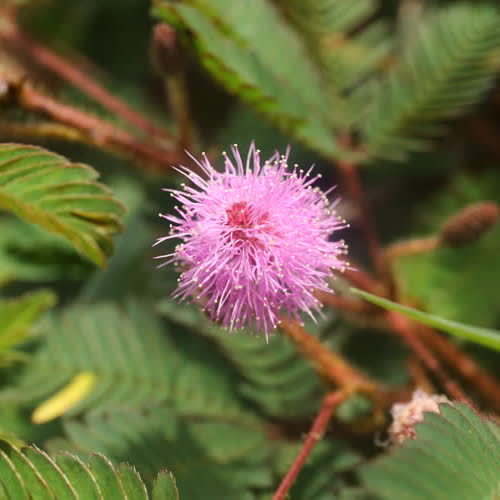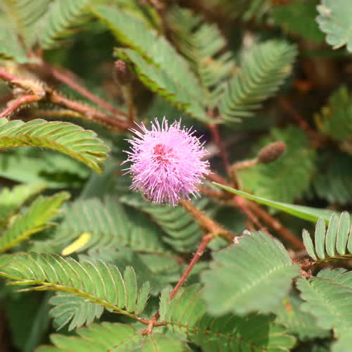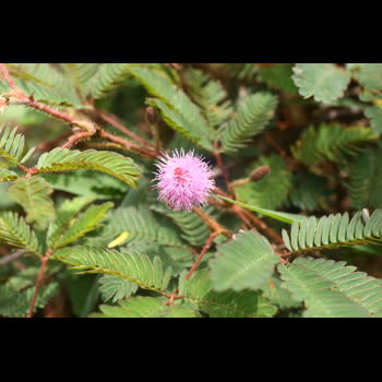 | คำอธิบาย : ไมยราบ มีชื่อวิทยาศาสตร์ว่า Mimosa pudica L. เป็นไม้ล้มลุก ทอดเลื้อยตามพื้นดิน บางครั้งสูงได้ถึง 1 ม. มีขนหยาบตามลำต้น แกนใบประกอบ ก้านใบ แผ่นใบด้านล่าง และช่อดอก แกนกลางใบรวมก้านยาว 2.5-5 ซม. ใบประกอบย่อยมี 2 คู่ เรียงชิดกันคล้ายรูปฝ่ามือ ยาว 1.5-7 ซม. ใบย่อยมี 12-25 คู่ รูปขอบขนานหรือรูปเคียว ยาว 0.5-1 ซม. ก้านช่อดอกยาว 2.5-4 ซม. ดอกไร้ก้าน รูประฆังแคบ ยาวประมาณ 2 มม. กลีบดอกมนกลม ยาว 0.5-0.8 มม. เกสรเพศผู้ 4 อัน รังไข่เกลี้ยง ฝักรูปขอบขนาน ยาว 1.5-1.8 ซม. ขอบมีขนแข็ง\มีถิ่นกำเนิดในอเมริกาใต้ นำเข้าโดยกรมทางหลวงเพื่อช่วยคลุมหน้าดิน แยกเป็น var. hispida Brenan กลีบดอกมีขน และ var. unijuga (Duchass. & Walp.) Griseb. กลีบดอกเกลี้ยง ชื่อสามัญ Sensitive plant, Touch-me-not ชื่ออื่น กระทืบยอด (จันทบุรี); กะหงับ (ภาคใต้); ก้านของ (นครศรีธรรมราช); นาหมื่อม้ะ (กะเหรี่ยง-แม่ฮ่องสอน); ไมยราบ, ระงับ (ภาคกลาง); หงับพระพาย (ชุมพร); หญ้าจิยอบ, หญ้าปันยอด (ภาคเหนือ); หนามหญ้าราบ (จันทบุรี) สืบค้นข้อมูลจาก สารานุกรมพืชในประเทศไทย (ฉบับย่อ)(Concise Encyclopedia of Plants in Thailand) |