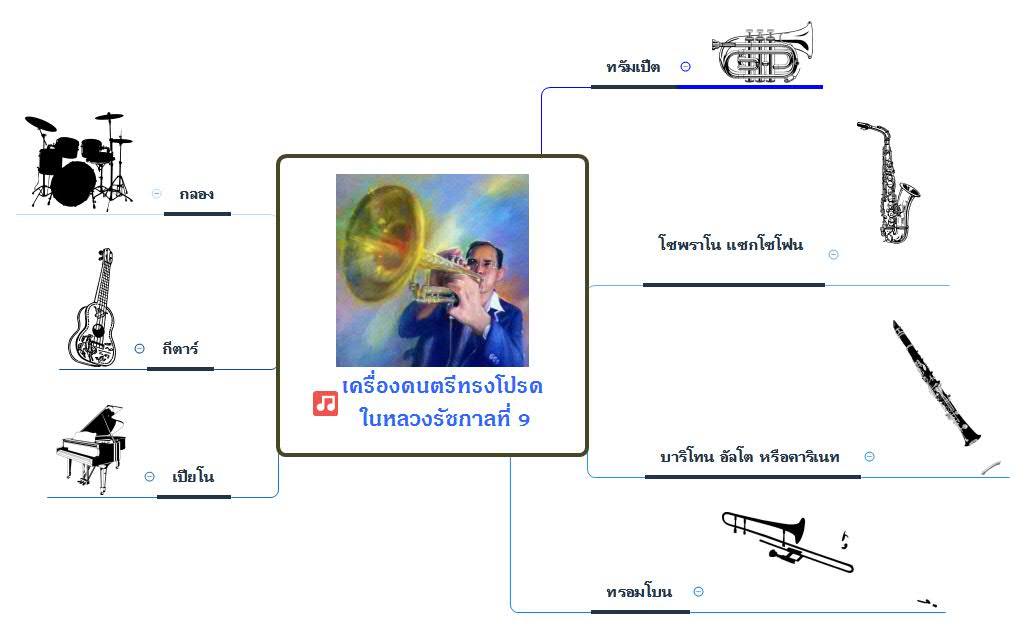 คำสำคัญ : รัชกาลที่ 9, แผนผังความคิด, เครื่องดนตรี, ในหลวง, XMind, พระปรีชาสามารถ, พระอัจฉริยภาพ, ดนตรี, Mind Map, พระบาทสมเด็จพระปรมินทรมหาภูมิพลอดุลยเดช |