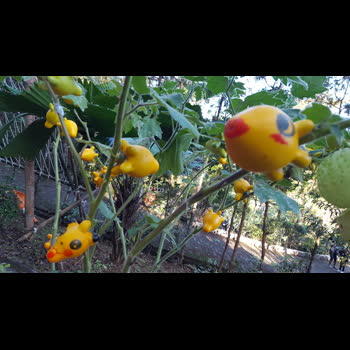 | คำอธิบาย : มะเขือการ์ตูน หรือ มะเขือมิกกี้เม้าส์ มะเขือนมแพะ (เต้านมวัว) มะเขือประดับ มะเขือสาแหรก มะเขือแฟนซี เป็นพืชล้มลุกอายุหลายปี อยู่ในตระกูลเดียวกับพริก มะเขือเทศ มันฝรั่ง และยาสูบ ผล ใบและต้นมีพิษสูง ทำให้เป็นอัมพาต |