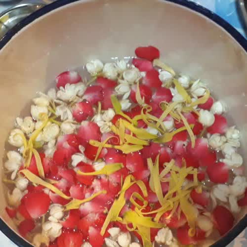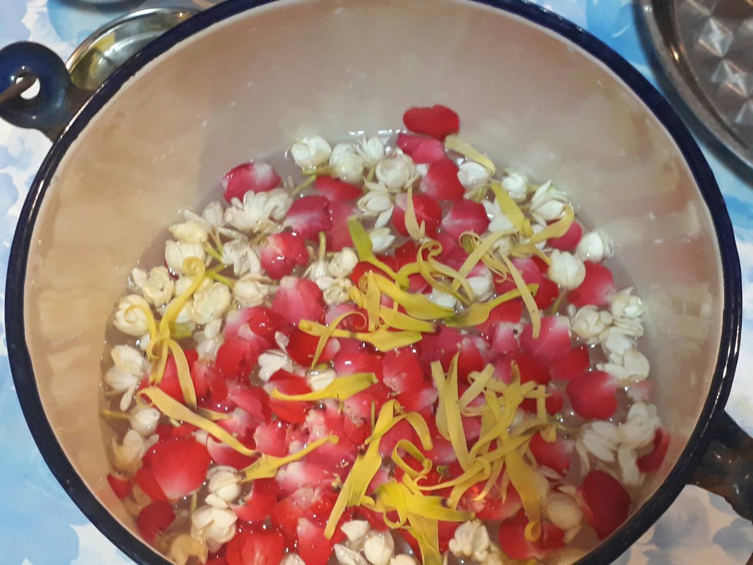 | คำอธิบาย : การลอยน้ำดอกไม้สด ประกอบด้วย น้ำบริสุทธิ์และดอกไม้หอมหลายๆชนิด เช่น กุหลาบ มะลิ จำปี กระดังงา และดอกไม้อื่นที่หาได้ตามต้องการ ต้องลอยในเวลาตอนเย็น พอรุ่งเช้าก็ตักดอกไม้ขึ้นจะได้น้ำดอกไม้สดที่มีกลิ่นหอม สามารถนำไปประกอบทำน้ำอบไทยต่อได้ |
