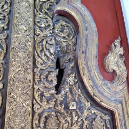 | คำอธิบาย : บานประตูศาลาการเปรียญ วัดใหญ่สุวรรณาราม มีชื่อเสียงทางประวัติศาสตร์และเป็นที่กล่าวขานถึงความงดงามเป็นเลิศของลวดลายอันวิจิตรบรรจงที่ปรากฎให้เห็นบนบานประตูแห่งนี้ ซึ่งเป็นบานประตูช่องกลางด้านหน้าของศาลาการเปรียญทางทิศตะวันออก ทำด้วยไม้สัก จำหลักลวดลายกระหนกก้านขด 2 ชั้น ปิดทองประดับกระจก กรอบเช็ดหน้าบานประตูทำไว้สวยงาม จึงมีผู้นำเป็นต้นแบบไปสร้างเป็นซุ้มประตู และซุ้มเรือนแก้วพระพุทธรูป ตอนบนของบานประตูด้านซ้ายมีรอยแตก เล่าว่าเคยถูกพม่าฟันเพื่อเข้าไปจับคนด้านใน ปรากฏเป็นร่องรอยแห่งประวัติศาสตร์มาจนทุกวันนี้ |