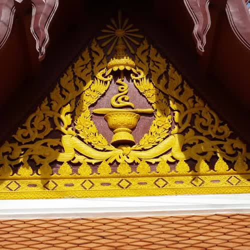 | คำอธิบาย : หน้าบันของซุ้มประตูระเบียงคดทางเข้าพระอุโบสถ มีทั้งหมดสี่ทิศ มีเลข ๕ ไทยเหมือนกันทั้งหมด 4 ด้าน มุมระเบียงคดที่มาบรรจบกันก็มีการสร้างเป็นซุ้มหลังคาคลุมและมีหน้าบันแบบเดียวกันทั้งหมด ยกเว้นซุ้มประตูด้านหน้าพระอุโบสถ รวมแล้วมีการประดับเลข ๕ ไทย 28 แห่ง ที่พิเศษคือ เลข ๕ กลับด้านที่อยู่ทางทิศเหนือติดกับถนน ตั้งใจทำเพื่อถวายความอาลัยแด่รัชกาลที่ ๕ |