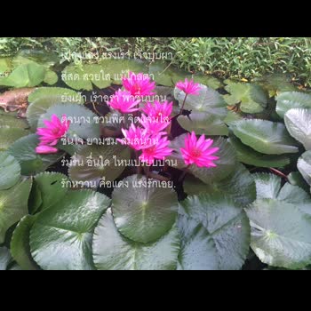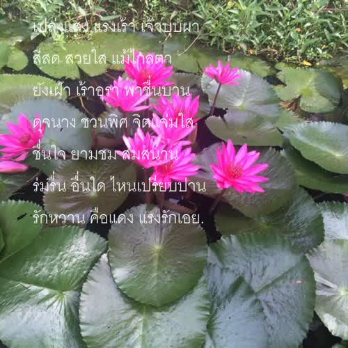 คำอธิบาย : บัวเอ๋ยบัวแดงเปล่งแสง แรงเร้า เจ้าบุบผา สีสด สวยใส แม้ไกลตายังเฝ้า เร้าอุรา พาชื่นบานดุจนาง ชวนพิศ จิตแจ่มใสชื่นใจ ยามชม สมสนานร่มรื่น อื่นใด ไหนเปรียบปานรักหวาน คือแดง แรงรักเอย. |