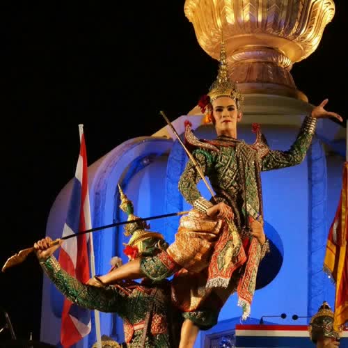 | คำอธิบาย : โขน การขึ้นลอย ท่าการต่อสู้ระหว่าง ทศกัณฐ์กับพระราม |