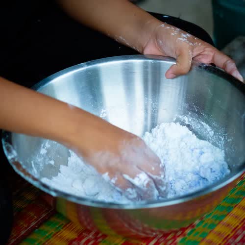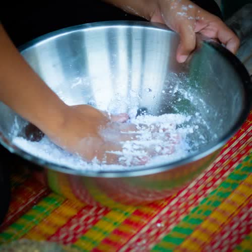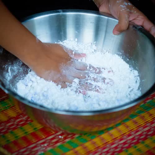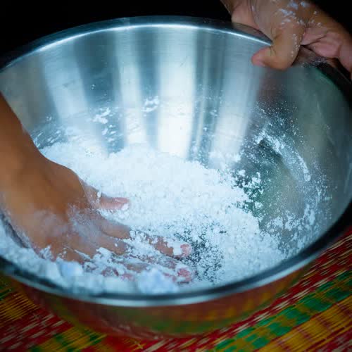 | คำอธิบาย : การยีแป้งของขนมเกสรลำเจียก |