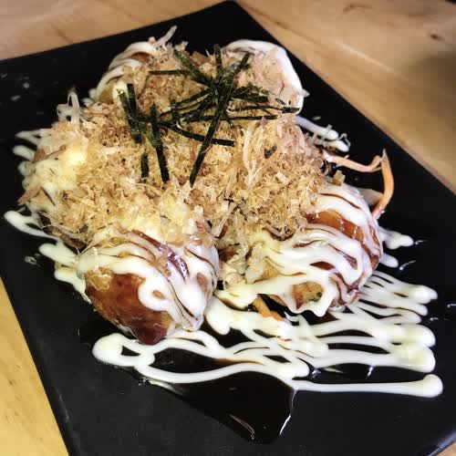 | คำอธิบาย : ทาโกะยากิ หรือขนมครกญี่ปุ่น เป็นเมนูอาหารญี่ปุ่นชนิดหนึ่ง มีลักษณะก้อนกลมๆทำจากแป้ง มีใส้ข้างใน ราดหน้าด้วยซีอิ๊วญี่ปุ่นหรือโรยด้วยผงปลาแห้ง |