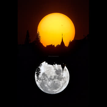 | คำอธิบาย : สถานที่ คันคลองชลประทาน ต.สุเทพ อ.เมือง เชียงใหม่ว/ด/ปี ที่บันทึกภาพ ถ่ายภาพสองช่วงเวลาในปี 2015 มารวมเป็นภาพเดียวCamera : Nikon D7000 Lens : Nikon AF 500 nano (Sun) /Tamron 500 Aperture : F 32 (Sun) F8 (Moon) Exposure : 1/8000 (Sun) 1/100 (Moon)WB :8000 (Sun) 3800 (Moon)ISO : 100(Sun) 800(Moon)Rem : ภาพรวมสองภาพต่างเวลา แต่ในสถานที่และมุมเมืองเดียวกัน ให้ความรู้สึกที่แตกต่างรวมทั้งการเลือกฉากหน้าที่มีความหมาย เทคนิคการถ่ายภาพในแนวนี้ ทำโดยอยู่ห่างจากฉากหน้าให้มากพอจนมีขนาดเท่ากับฉากหลังคือประมาณ 1 องศา(ระยะเชิงมุม) วัตถุทั้งสองจะมีขนาดใกล้เคียงกัน ส่วนตำแหน่งการตกของดวงอาทิตย์ ณ วัดพระธาตุนั้นได้มาจากสังเกตและคำนวณล่วงหน้า |