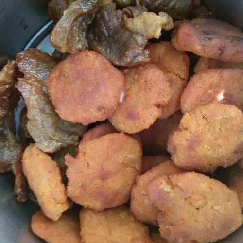 | คำอธิบาย : หมูทอดกับลูกเห็ดทอด (ลูกเห็ดทอดเป็นชื่อท้องถิ่น หมายถึง ทอดมัน) |