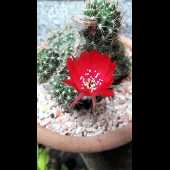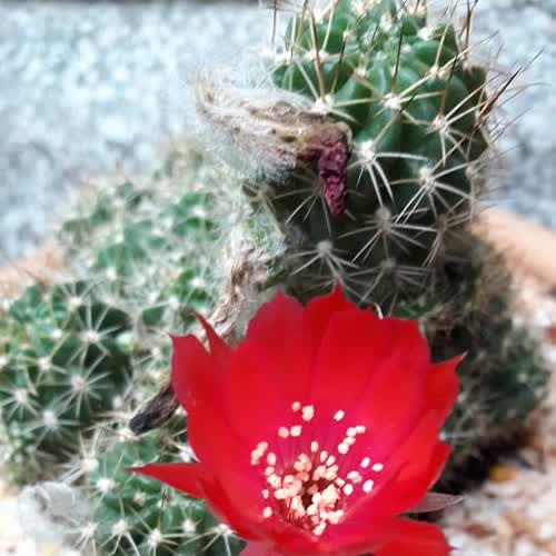 | คำอธิบาย : อิชินอฟซิส ดอกสีแดง แคคตัส (cactus) ที่มีหนามคม เป็นไม้อวบน้ำ (succulent) ประเภทตะบองเพชร |