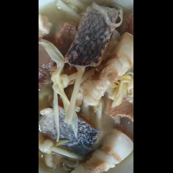 | ชื่อเรื่อง : หมูสามชั้นต้มส้มแขกใส่ปลาช่อนแห้งและดอกไม้จีน |