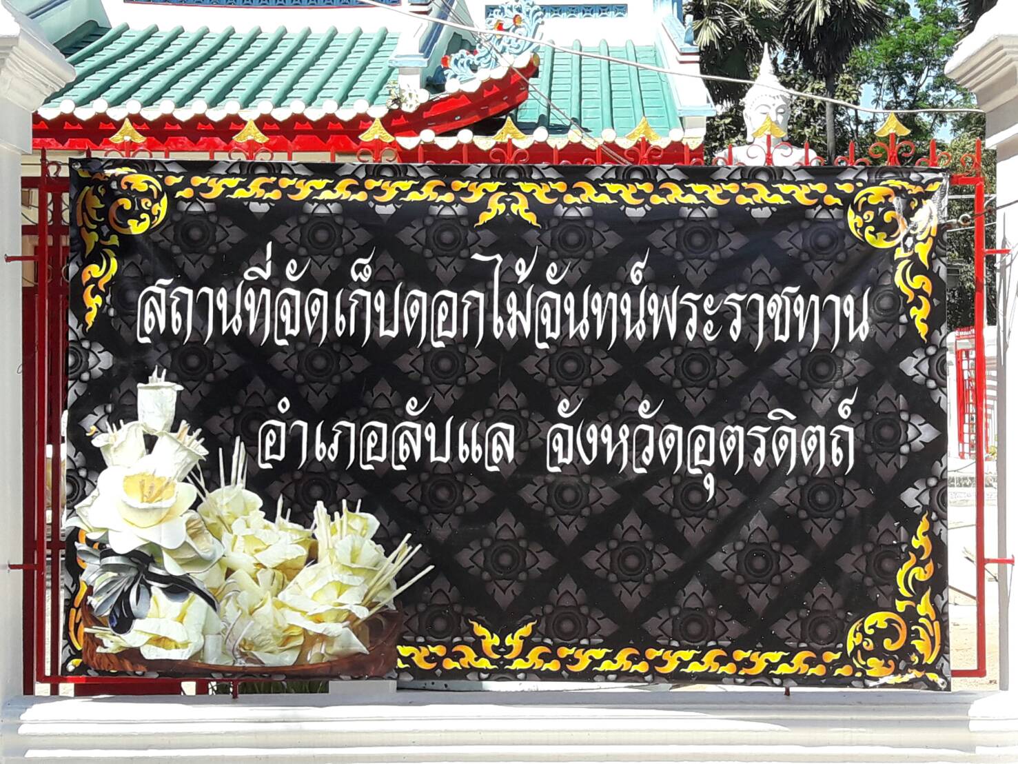 | คำอธิบาย : สถานที่วางดอกไม้จันทน์ พระเมรุมาศจำลอง ณ บริเวณวัดพระแท่นศิลาอาสน์ ตำบลทุ่งยั้ง อำเภอลับแล จังหวัดอุตรดิตถ์ เมื่อวันที่ 9 ตุลาคม 2560 |