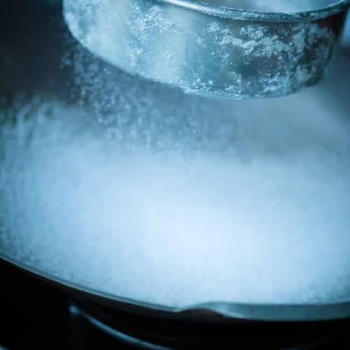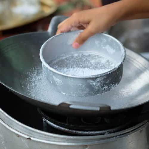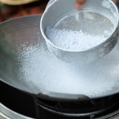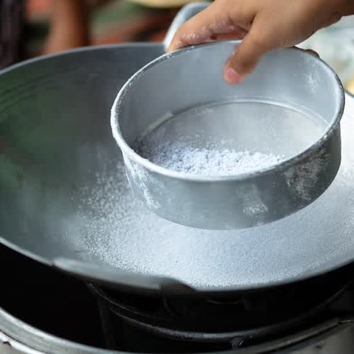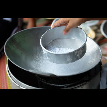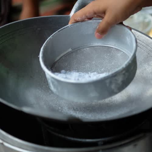 | คำอธิบาย : การร่อนแป้งลงกระทะเพื่อทำขนมเกสรลำเจียก |