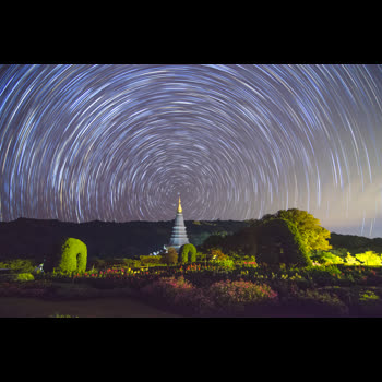 | คำอธิบาย : สถานที่ พระมหาธาตุนภเมทนีดล-นภพลภูมิสิริ กองทัพอากาศ ดอยอินทนนท์ว/ด/ปี ที่บันทึกภาพ 2016-06-16 เวลา 02:22 AMCamera : Nikon D7000 Lens : AF 18-55 mm Aperture : F 3.5Exposure : 25 sec x 100 images WB : 3800ISO : 1600Rem : ภาพดาวหมุนโดยหามุมให้ดาวเหนืออยู่บนยอดพระมหาธาตุฯ โดยถ่ายภาพต่อเนื่องและรวมเป็นภาพเส้นแสงดาว |