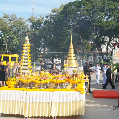 | คำอธิบาย : พิธีบวงสรวงอัญเชิญนพปฏลสุวรรณฉัตรเหนือพระเมรุมาศจำลอง ในพิธีถวายดอกไม้จันทน์ งานพระราชพิธีถวายพระเพลิงพระบรมศพพระบาทสมเด็จพระปรมินทรมหาภูมิพลอดุลยเดชฯ รัชกาลที่ ๙ ณ บริเวณศาลากลางจังหวัดนครสวรรค์ เมื่อวันที่ ๑๐ ตุลาคม ๒๕๖๐ |