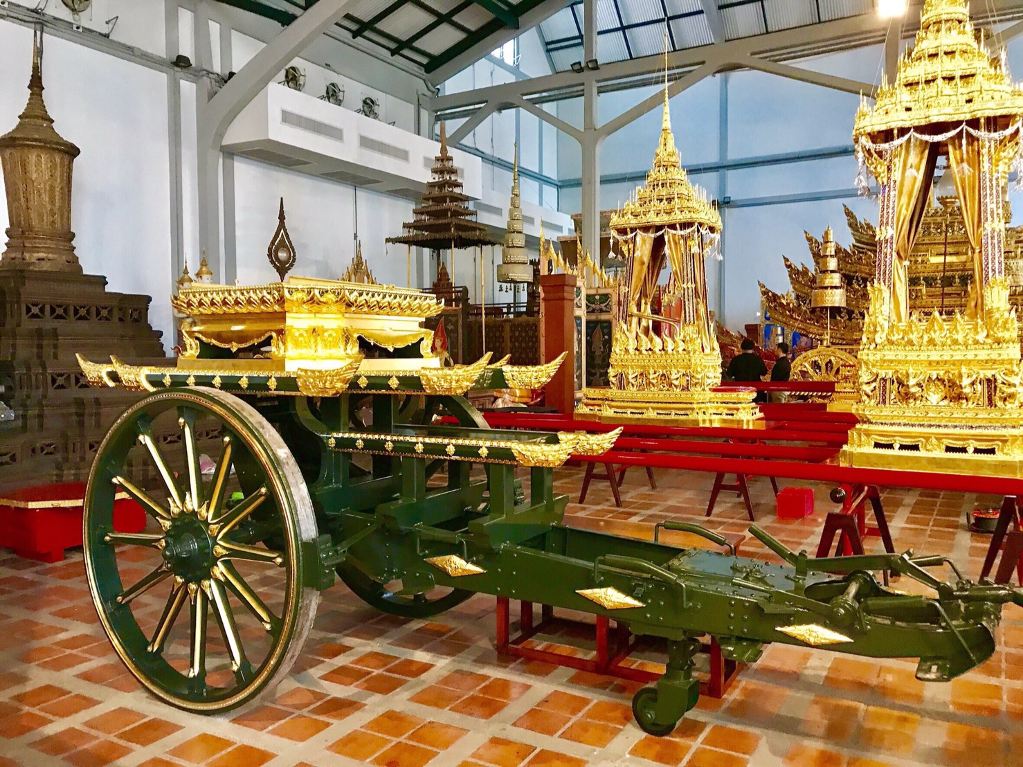 | คำอธิบาย : ราชรถปืนใหญ่องค์จริง ที่ใช้ในพระราชพิธีพระบรมศพ พระบาทสมเด็จพระปรมินทรมหาภูมิพลอดุลยเดช รัชกาลที่ 9 ราชรถปืนใหญ่จะอยู่ในริ้วขบวนพระอิสริยยศที่ 3 เป็นราชรถองค์สำคัญ เมื่อพระมหาพิชัยราชรถเทียบหน้าพระเมรุมาศใช้เกรินบันไดนาคเพื่ออัญเชิญพระบรมโกศทองใหญ่ลงจากพระมหาพิชัยราชรถ ขึ้นประดิษฐานบนราชรถปืนใหญ่ เวียนรอบพระเมรุมาศ 3 รอบ ก่อนประดิษฐานบนพระจิตกาธาน (เชิงตะกอน) ตั้งอยู่บนฐานชาลาชั้นบนสุดภายในบุษบกองค์ประธาน พระเมรุมาศ กรมสรรพวุธทหารบก ได้รับมอบหมายให้สร้างราชรถปืนใหญ่จัดสร้างขึ้นมา 3 องค์ ใช้ในพระราชพิธีพระบรมศพ 1 องค์ ใช้ในพิธีซ้อม 1 องค์ เพื่อใช้สำรอง 1 องค์ ทั้ง 3 องค์ สร้างขึ้นเหมือนกันทุกประการทั้งขนาดและน้ำหนัก(ข้อมูลจาก พิธีซ้อมริ้วขบวน วันที่ 15 ตุลาคม 2560) |