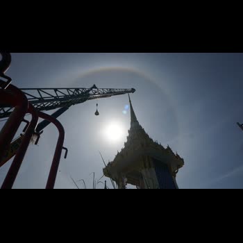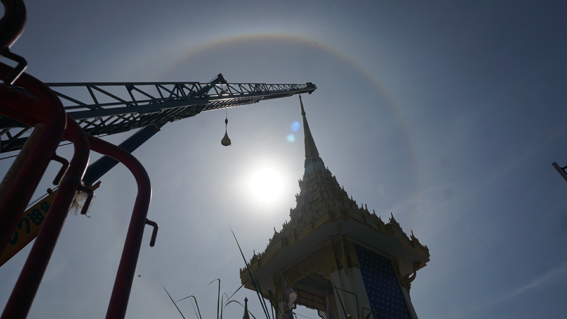 | คำอธิบาย : ปรากฎการณ์พระอาทิตย์ทรงกลด ในระหว่างพิธีบวงสรวงอัญเชิญนพปฏลสุวรรณฉัตรเหนือพระเมรุมาศจำลอง ในพิธีถวายดอกไม้จันทน์ งานพระราชพิธีถวายพระเพลิงพระบรมศพพระบาทสมเด็จพระปรมินทรมหาภูมิพลอดุลยเดชฯ รัชกาลที่ ๙ ณ บริเวณศาลากลางจังหวัดนครสวรรค์ เมื่อวันที่ 10 ตุลาคม 2560 |