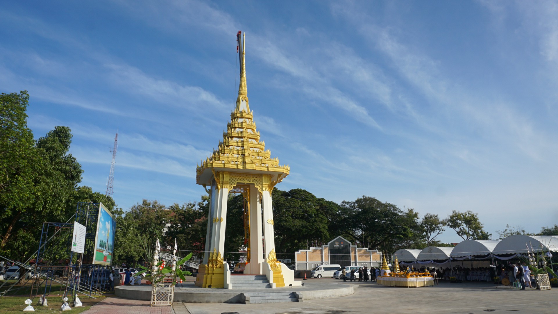 | คำอธิบาย : พิธีบวงสรวงอัญเชิญนพปฏลสุวรรณฉัตรเหนือพระเมรุมาศจำลอง ในพิธีถวายดอกไม้จันทน์ งานพระราชพิธีถวายพระเพลิงพระบรมศพพระบาทสมเด็จพระปรมินทรมหาภูมิพลอดุลยเดชฯ รัชกาลที่ ๙ ณ บริเวณศาลากลางจังหวัดนครสวรรค์ เมื่อวันที่ 10 ตุลาคม 2560 |