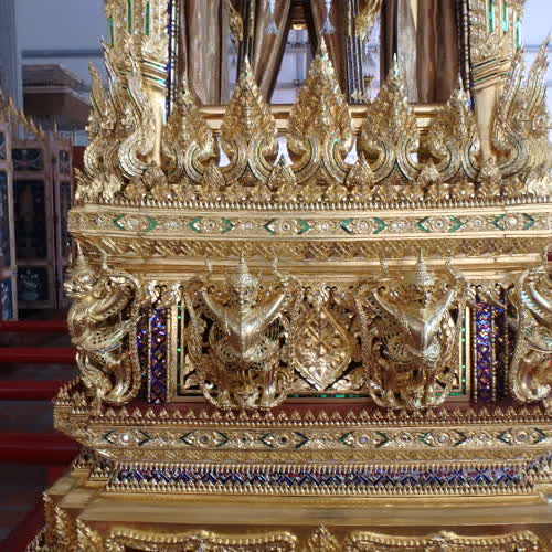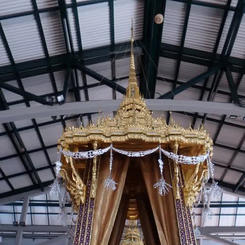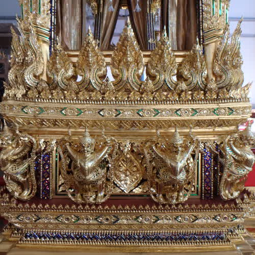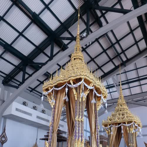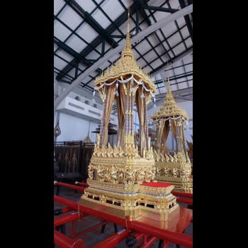 | คำอธิบาย : พระที่นั่งราเชนทรยานน้อย เป็นพระราชยานคานหาม มีลักษณะเป็นทรงบุษบก ทำด้วยไม้แกะสลักปิดทอง ประดับกระจก พระราชยานองค์นี้สร้างใหม่เพื่อทดแทนของเดิม เพื่อใช้ในงานพระราชพิธีถวายพระเพลิงพระบรมศพ พระบามสมเด็จพระปรมินทรมหาภูมิพลอดุลยเดช บรมนาถบพิตร ใช้สำหรับเชิญพระผอบพระบรมราชสรีรางคารจากพระเมรุมาศท้องสนามหลวงเข้าสู่พระบรมราชวัง มีขนาด กว้าง 1.00 เมตร ยาว ยาว 5.48 เมตร (พร้อมคานหาม) สูง 4.14 เมตร มีคานหาม 4 คาน ใช้พลแบกหาม 56 นาย |