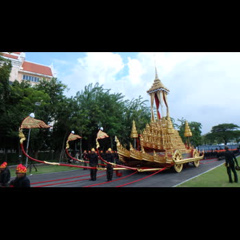 | คำอธิบาย : พระมหาพิชัยราชรถ เป็นราชรถทรงบุษบก ทำด้วยไม้แกะสลัก ลงรักปิดทอง ประดับกระจก สร้างขึ้นในรัชสมัยพระบาทสมเด็จพระพุทธยอดฟ้าจุฬาโลกมหาราช เพื่อใช้อัญเชิญพระโกศพระอัฐิสมเด็จพระปฐมบรมมหาชนก (ทองดี) ออกพระเมรุ เมื่อปี พ.ศ.2339 ต่อมาใช้อัญเชิญพระบรมโกศพระมหากษัตริย์และพระโกศพระบรมวงศ์จนถึงปัจจุบัน มีขนาด กว้าง 4.88 เมตร ยาก 18 เมตร สูง 11.20 เมตร หนัก 13.7 ตัน ใช้พลฉุดชัก 216 นาย (ด้านหน้า 172 นาย ด้านหลัง 44 นาย) |