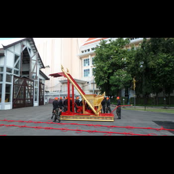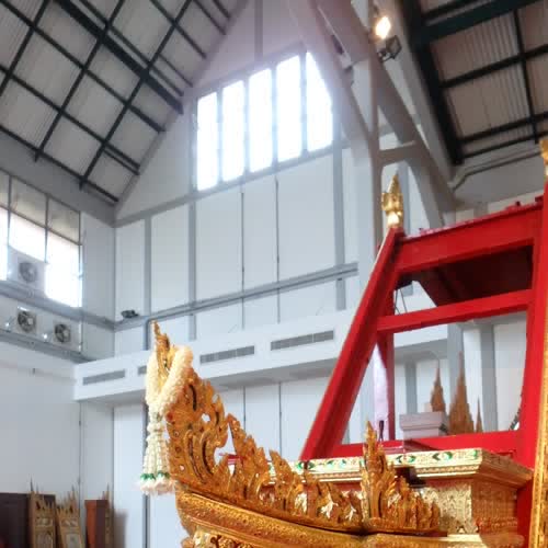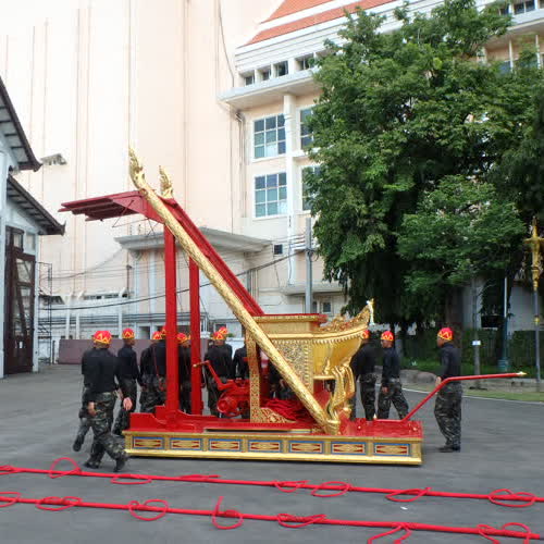 | คำอธิบาย : เกรินบันไดนาค มี 2 องค์ ใช้อัญเชิญพระบรมโกศหรือพระโกศขึ้นประดิษฐาน และอัญเชิญลงจากพระมหาพิชัยราชรถ หรือเวชยันตราชรถ คิดค้นโดย สมเด็จพระสัมพันธวงศ์เธอ เจ้าฟ้ากรมหลวงพิทักษ์มนตรี (จุ้ย) พระโอรสในสมเด็จพระเจ้าพี่นางเธอ เจ้าฟ้ากรมพระศรีสุดารักษ์ ใช้ครั้งแรกในพระราชพิธีถวายพระเพลิงพระบรมศพ พระบาทสมเด็จพระพุทธยอดฟ้าจุฬาโลกมหาราช เมื่อพ.ศ.2355 |