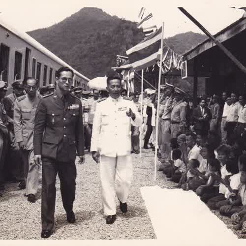 | คำอธิบาย : พระบาทสมเด็จพระเจ้าอยู่หัว และสมเด็จพระนางเจ้าฯ พระบรมราชินีนาถ เสด็จพระราชดำเนินโดยขบวนรถไฟพระที่นั่งดีเซลรางนิอิกาตะ ไปทรงถวายผ้าพระกฐินต้น ณ วัดเทวสังฆาราม และทรงเยี่ยมเยียนราษฎรจังหวัดกาญจนบุรี เมื่อวันที่ 26 ตุลาคม 2506 |