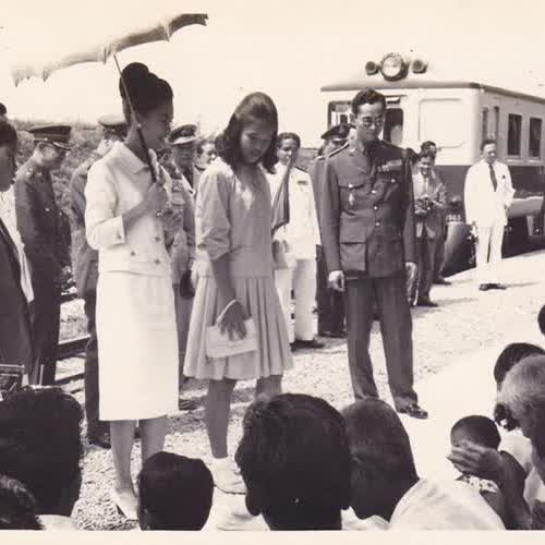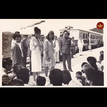 | คำอธิบาย : พระบาทสมเด็จพระเจ้าอยู่หัว และสมเด็จพระนางเจ้าฯ พระบรมราชินีนาถ เสด็จพระราชดำเนินโดยขบวนรถไฟพระที่นั่งดีเซลรางนิอิกาตะ ไปทรงถวายผ้าพระกฐินต้น ณ วัดเทวสังฆาราม และทรงเยี่ยมเยียนราษฎรจังหวัดกาญจนบุรี เมื่อวันที่ 26 ตุลาคม 2508 |