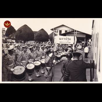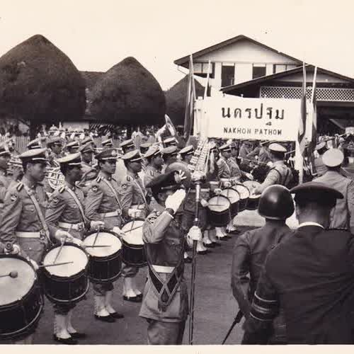| คำอธิบาย : พระบาทสมเด็จพระเจ้าอยู่หัว และสมเด็จพระนางเจ้าฯ พระบรมราชินีนาถ เสด็จพระราชดำเนินโดยขบวนรถไฟพระที่นั่งดีเซลรางนิอิกาตะ ไปทรงถวายผ้าพระกฐินต้น ณ วัดเทวสังฆาราม และทรงเยี่ยมเยียนราษฎรจังหวัดกาญจนบุรี เมื่อวันที่ 26 ตุลาคม 2507 |