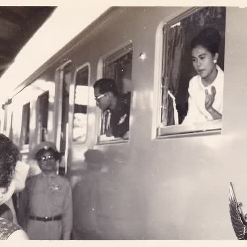 | คำอธิบาย : พระบาทสมเด็จพระเจ้าอยู่หัว และสมเด็จพระนางเจ้าฯ พระบรมราชินีนาถ เสด็จพระราชดำเนินโดยขบวนรถไฟพระที่นั่งดีเซลรางนิอิกาตะ ไปทรงถวายผ้าพระกฐินต้น ณ วัดเทวสังฆาราม และทรงเยี่ยมเยียนราษฎรจังหวัดกาญจนบุรี เมื่อวันที่ 26 ตุลาคม 2508 |