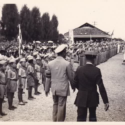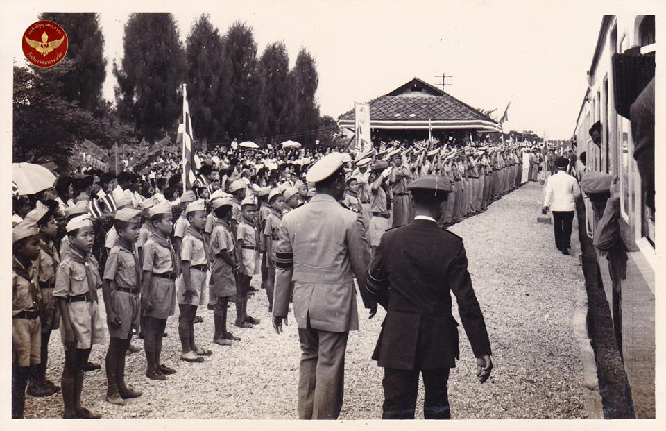 | คำอธิบาย : พระบาทสมเด็จพระเจ้าอยู่หัว และสมเด็จพระนางเจ้าฯ พระบรมราชินีนาถ เสด็จพระราชดำเนินโดยขบวนรถไฟพระที่นั่งดีเซลรางนิอิกาตะ ไปทรงถวายผ้าพระกฐินต้น ณ วัดเทวสังฆาราม และทรงเยี่ยมเยียนราษฎรจังหวัดกาญจนบุรี เมื่อวันที่ 26 ตุลาคม 2512 |