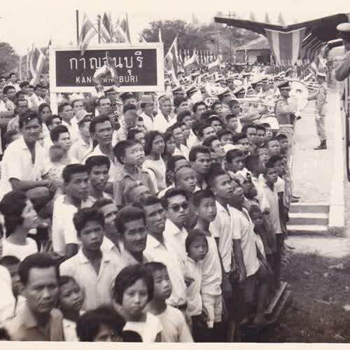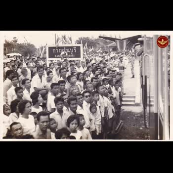 | คำอธิบาย : พระบาทสมเด็จพระเจ้าอยู่หัว และสมเด็จพระนางเจ้าฯ พระบรมราชินีนาถ เสด็จพระราชดำเนินโดยขบวนรถไฟพระที่นั่งดีเซลรางนิอิกาตะ ไปทรงถวายผ้าพระกฐินต้น ณ วัดเทวสังฆาราม และทรงเยี่ยมเยียนราษฎรจังหวัดกาญจนบุรี เมื่อวันที่ 26 ตุลาคม 2516 |